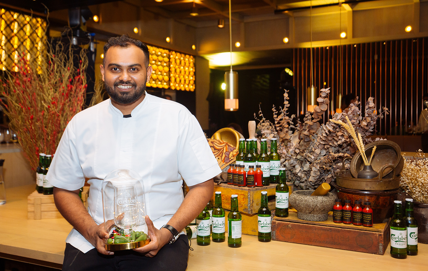 Kicking-off the evening with mouth-watering welcome bites, Chef Mano Thevar initiated diners with fluffy Chilli Cheese Kulcha served with a deliciously creamy Carlsberg Smooth Draught infused butter. Once guests were seated, they were treated to the culinary performance of Chef Mano and his crew working like clockwork behind the open kitchen. The debut for the evening came in an explosion of layered flavours that encapsulated the senses with an opening snack of Beetroot Chaat, Maitake Mushroom Samosa and Chettinad Chicken Taco or Vindaloo Jackfruit Taco on the vegetarian menu.