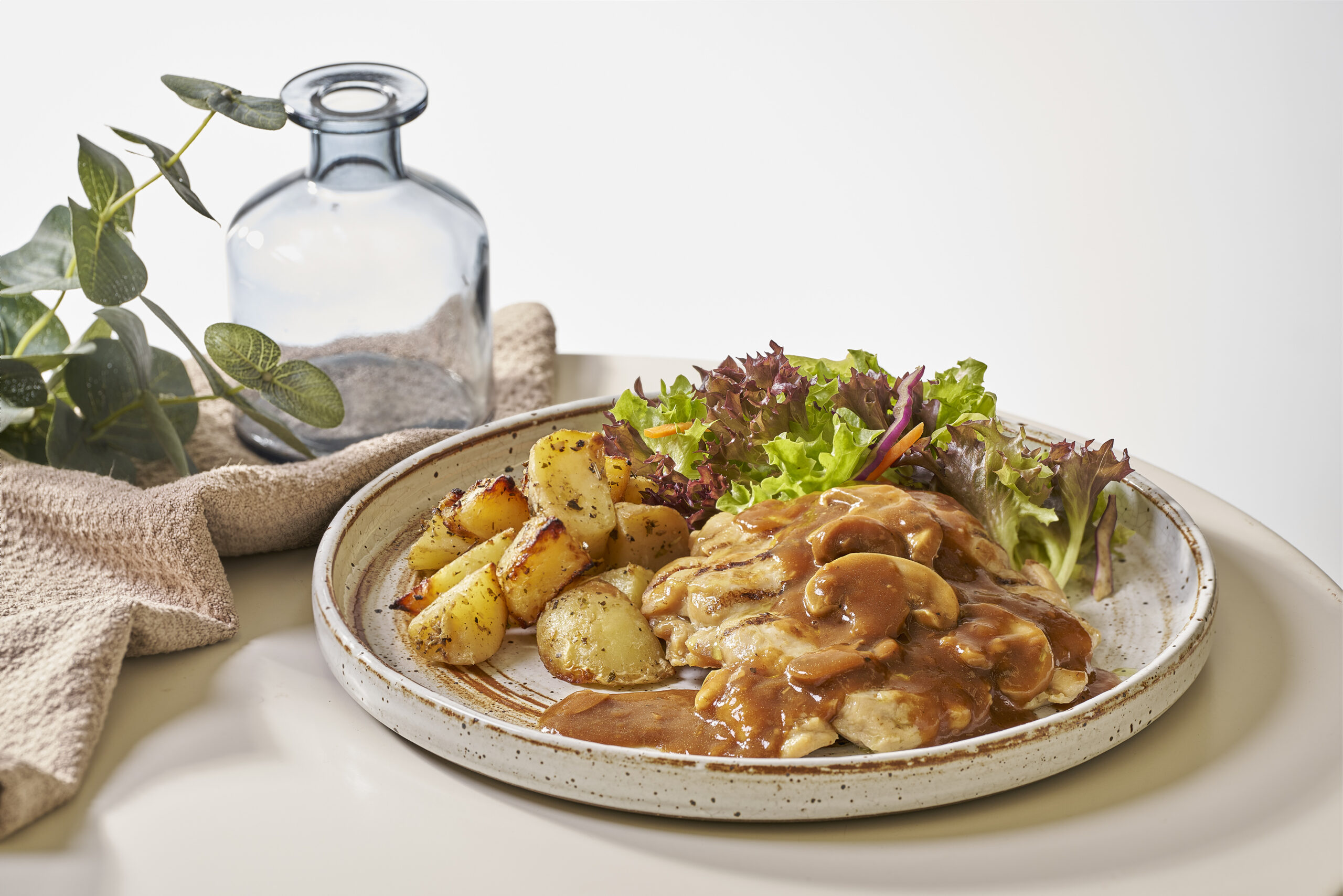 The Signature Black Pepper Chicken Chop features tender marinated chicken drizzled with black pepper sauce for a slight kick. Customers can also opt for the Signature Mushroom Chicken Chop, a juicy grilled chicken coated with creamy mushroom sauce. Both are served with golden-brown roasted potatoes and fresh garden salad.