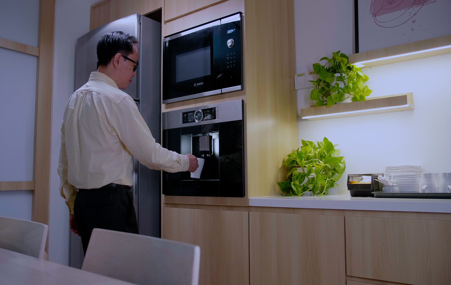 Constructed using Bosch power tools, the Well-being Haven space is equipped with an ergonomic kitchenette that includes a microwave, a built-in coffee machine, and a refrigerator from Bosch’s home appliances line, as well as the right ambience setting