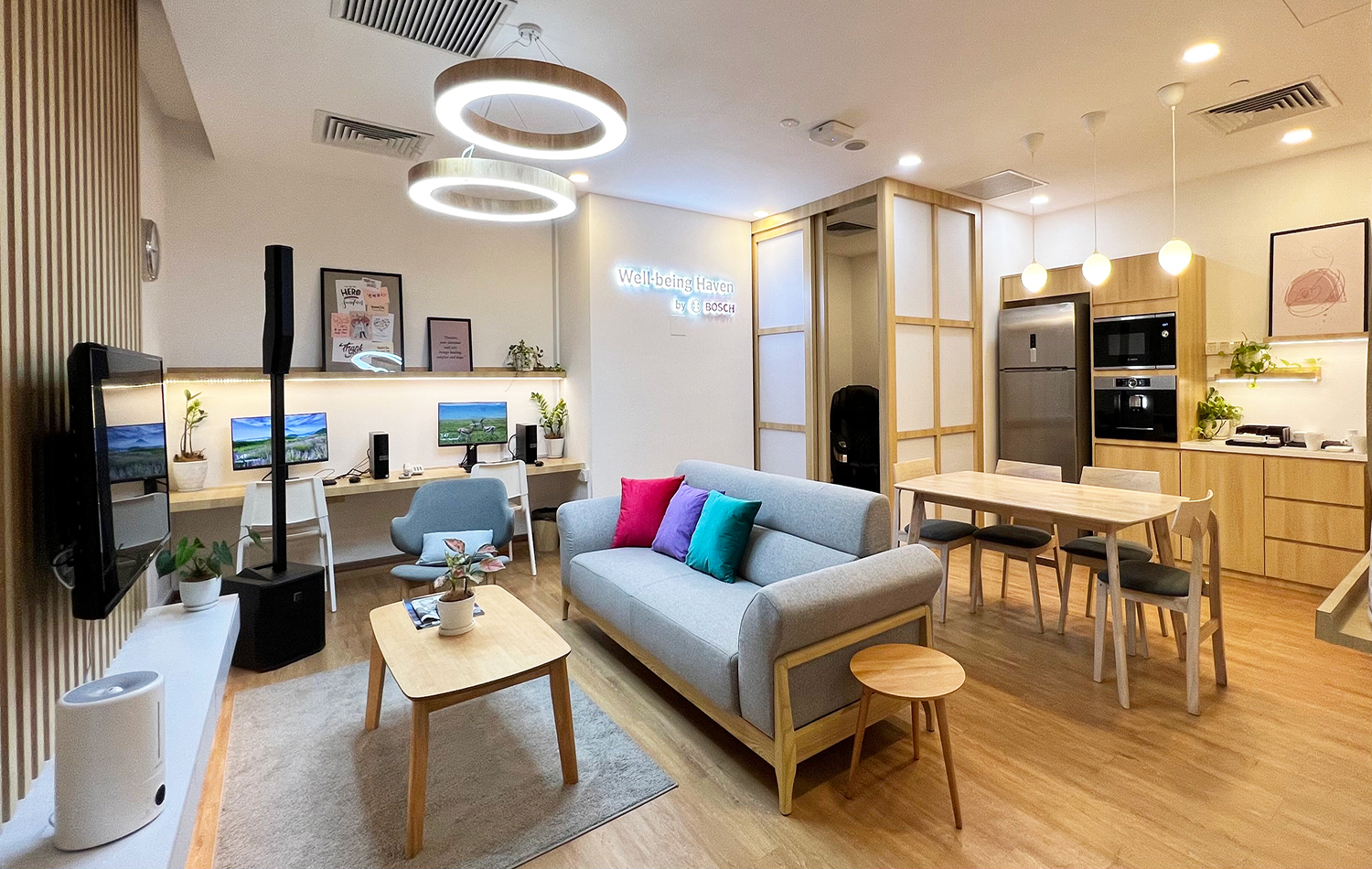 Well-being Haven is an experience-based project aiming to improve the work environment of healthcare workers by providing them with an appropriate recovery area, equipped with Bosch technology and solutions. The interest in more adequate resting spaces was expressed in a survey conducted by Bosch among almost 2,000 healthcare workers in Malaysia. Answering to this need, Bosch piloted the project by transforming SMCV’s existing lounge into a space that feels welcoming, calming, and is conducive to rest and recuperate.